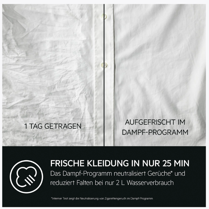 Dampfen statt Waschen ist eine der besten Methoden, um Kleidung aufzufrischen, die noch nicht gewaschen werden muss. Die 7000 ProSteam® Waschmaschinen verwenden Dampf, um Gerüche und Falten in nur 25 Min. aus deiner Kleidung zu entfernen. Dies schont das Gewebe und verbraucht nur 2 L Wasser.